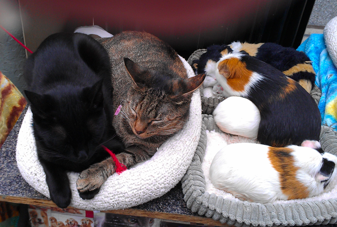 The oh-so-cute kitten right/top could be fake, but there is definitely the back end of a guinea pig sticking out, halfway up the right side. Unless that’s a fake too (But who would fake a guinea pig’s ass?).