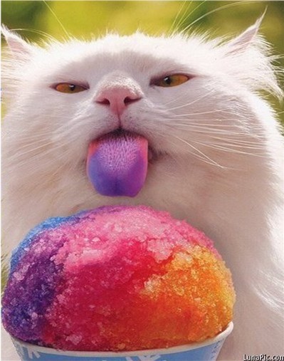 Tie dye hippie cat, drunk on corn syrup.