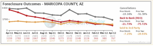 Bank repossessions in Maricopa County plunged from 3,159 in April 2011 to a mere 767 a year later. Clearly, the banks are gambling that this will help to stem the decline of home prices….