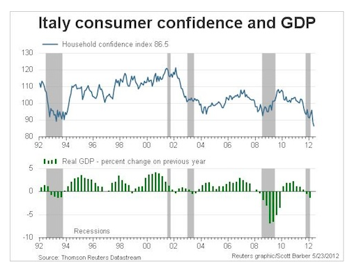As you can also see from the chart, GDP growth is now negative with the 2012 Q1 figure coming in at -0.8% taking Italy deeper into recession. The Bank of Italy suggested the yearly figure will come in around -1.5% but with a solid trend in place that figure could now be optimistic. Unemployment has also increased by 2% this year to stand at Eurozone record high of 9.8% with youth unemployment hovering in the mid 30s. To add to the woe, business confidence is the lowest it has been since the GFC and consumer confidence is now at record lows: