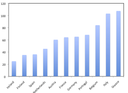 Right before the financial crisis of 2007-8, few Eurozone countries could claim to have been fiscally disciplined. The figure below shows that Finland, Spain and Ireland could, but not Greece and Italy. Most other Eurozone nations – including Germany – were in the grey zone. Then the wheels of fortune that drive self-fulfilling crises started to spin, leaving us with an impression that strong moral judgments have to be terribly relative.