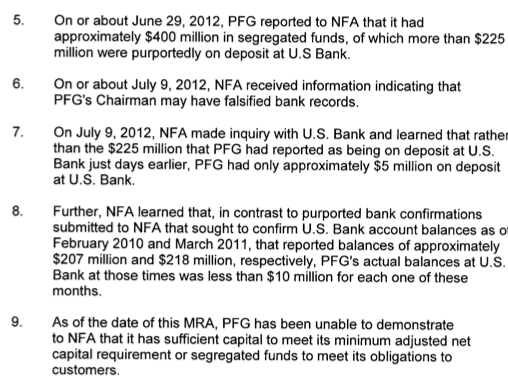 The NFA said it has taken “Member Responsibility Action to protect customers because PFG has failed to demonstrate that it meets capital requirements and segregated funds requirements.” The group also said it “has reason to believe” the firm doesn’t have enough assets to meet obligations to customers.