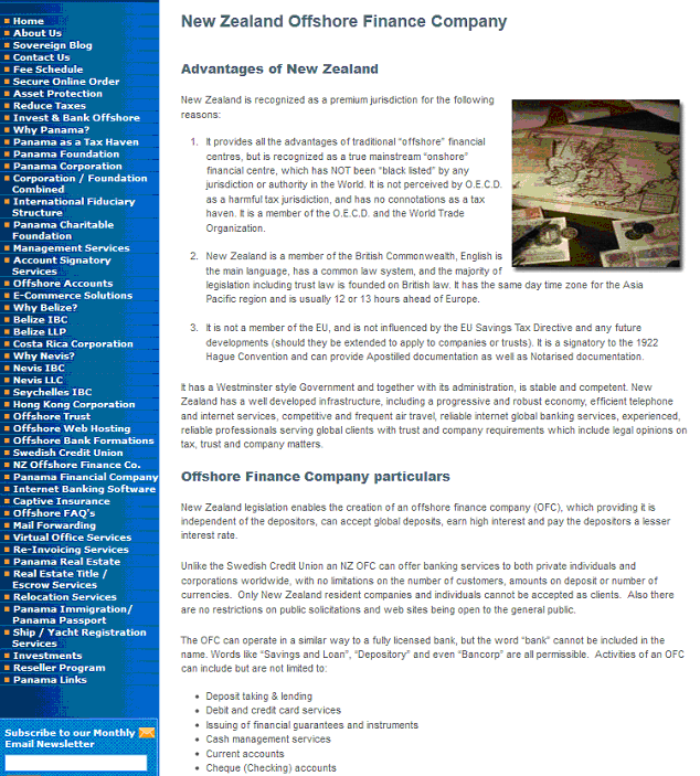 Yet, quite unperturbed by the dissolution of the underlying business entity, Sovereign Management and Legal’s web site is apparently still in full swing. On “New Zealand Offshore Finance Companies” the site says: