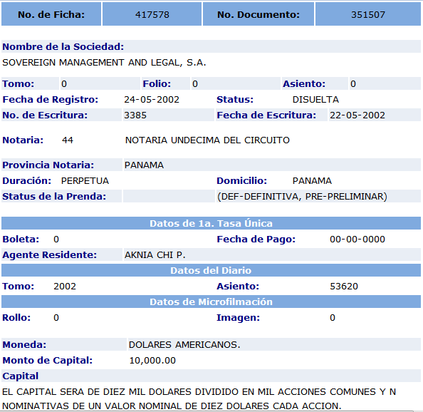 Eurocommerce’s director, Aknia Chi, turns out to be a Panamanian lawyer with an offshore company registration business, Sovereign Legal and Management SA (FFS! 12 Feb 2015) Sovereign Management and Legal SA of Panama, which has been dissolved (“disuelta”):