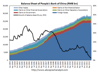 Besides the observation that most of the PBOC assets are foreign, it has become obvious that the pace of balance sheet expansion has slowed. The first notable and persistent slowdown in balance sheet expansion happened during the 2008/09 financial crisis, when the pace of PBOC balance sheet expansion slowed from well above 30% yoy to around 10%. The most recent slowdown of the pace of balance sheet expansion is happening right now, by less than 3% at June 2012 compared with the same month last year. The source of the current slowdown in balance sheet expansion is very obvious, which is the end of foreign assets accumulation.