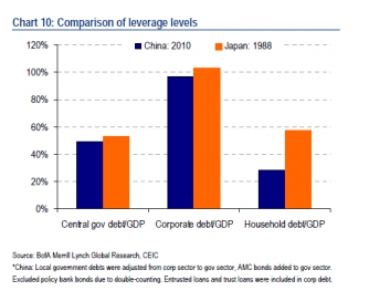 The chart below from Bank of America Merrill Lynch illustrates the problem (which is, by the way, from the same note we mentioned about zombies). It compares the leverage levels of different sector of the economy between China in 2010 and Japan 1988. As you can see, with the exception of household debt, the debt-to-GDP ratio for other sectors are not much different between China in 2010 and the pre-bubble-burst Japan:
