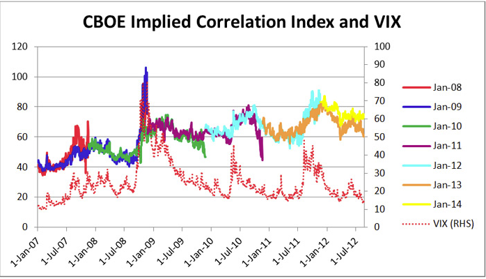 You can see this in the behaviour of both VIX and the implied correlation index in late 2008, when Lehman collapsed. As VIX spiked to over 80 in November that year, the nearest-dated correlation index (January 2009) rose to over 100.