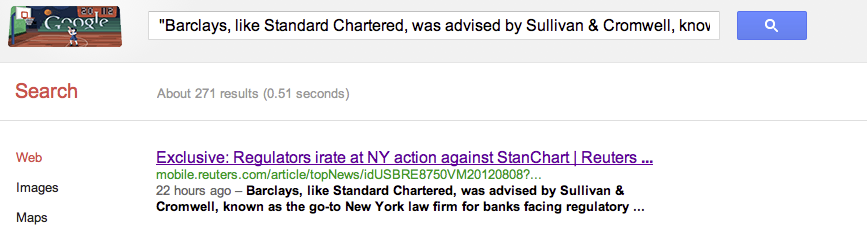 Hi Yves, I did a search on duckduckgo around 9:30 pm (on phrase “Standard Chartered hired Promontory Financial Group, a Washington D.C. consulting”) — it brought up three results, emptywheel plus two other sites that carried the original Reuters story (no Reuters link though).