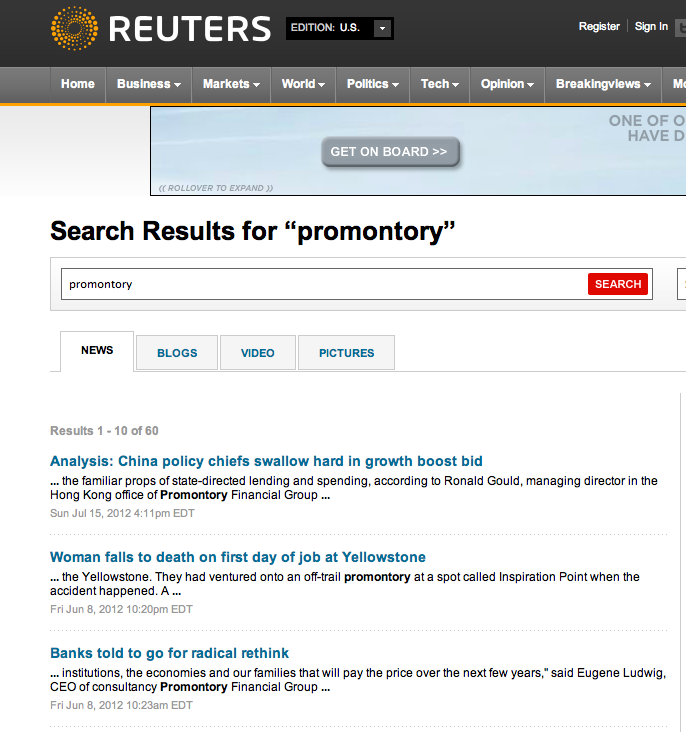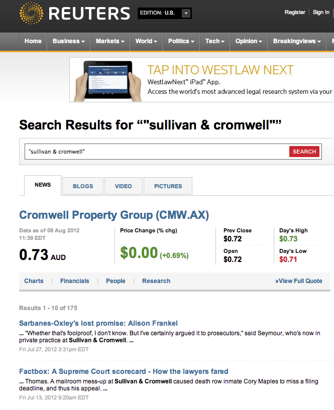 Now why is this significant? The parts that Marcy focused on, the role of Sullivan & Cromwell and Promontory, are gone. And I mean gone. This version of the story has been expunged from the Reuters website. I did these searches on the Reuters site at just after midnight on the 9th (note the results are in reverse chronological order, so the one at the top is the most recent):