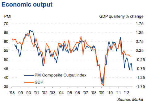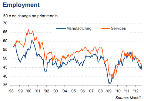 ”We had hoped that the news regarding the ECB’s intervention to alleviate the debt crisis would have lifted business confidence, but instead sentiment appears to have taken a turn for the worse, with businesses the most gloomy since early-2009 due to ongoing headwinds from slower global growth. This gloom is clearly reflected in headcounts falling at the fastest rate since January 2010 as companies seek to adjust to weaker demand.