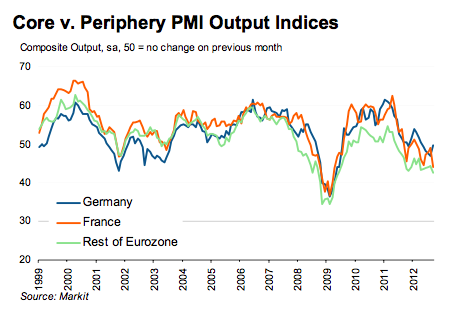 “Some good news came from an easing in the rate of contraction in Germany, though the rate of decline accelerated markedly in France and a deepening downturn was also evident in the periphery. It remains too early to say, however, whether Germany will continue to buck the trend, especially as it continued to see a strong rate of loss of new orders in both manufacturing and services.”