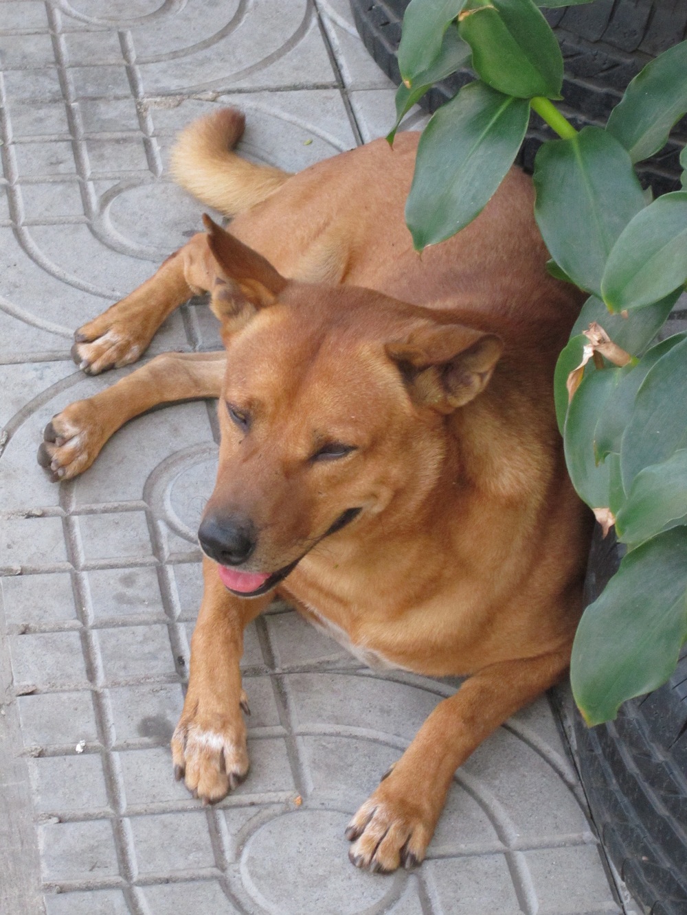 Antidote du jour: Bangkok dog guarding urban garden. Note flowers in tires (instead of pots).
