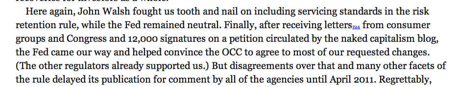 Bair’s acknowledgement in the book that Yves’ petition drive also had a significant impact in arming the pro-citizen/ anti-plutocrat die-hards that still exist in the regulatory agencies should be front page news, rather than a footnote in an outgunned regulator’s memoir. Apparently, there are folks working at consumer protection agencies, who really do want to protect their consumer constituents. Who Knew?