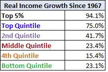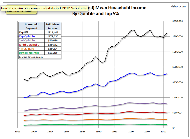 Doug Short at Global Economic Intersection has a must-read post that pulls together some Census Report data on US incomes since 1967 and draws some conclusions. He looks first at real, rather than nominal, incomes, and shows how income in the top 5% and top quintile have grown faster than for the rest of the population:
