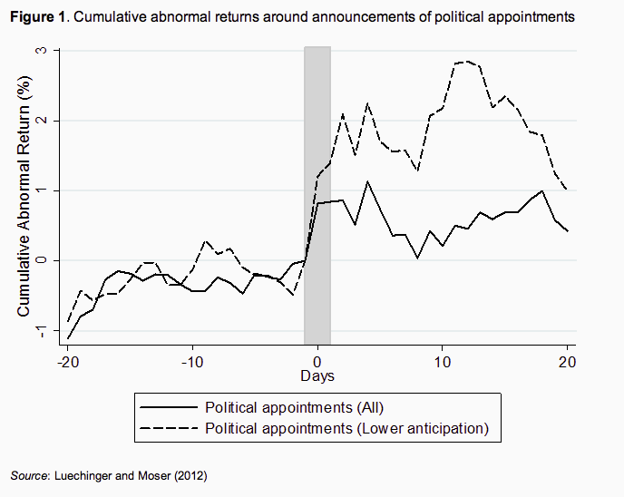 Luechinger, Simon and Christoph Moser (2012), “The Value of the Revolving Door: Political Appointees and the Stock Market,” KOF Working Papers No. 310 and CESifo Working Paper No. 3921.