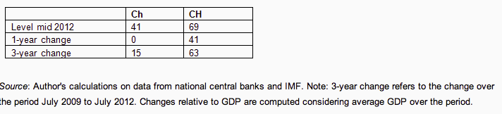 Table 1 shows that on all measures CH emerges as the greater ‘manipulator’ than Ch. At the middle of 2012 the value of the foreign-exchange reserves (largely held in euro) of CH amounted to close to 70% of GDP; almost twice as much as the roughly 40% of GDP for Ch. Over the last 12 months Ch has actually stopped intervening, but this might be due to transitional factors. The three year perspective might thus be more appropriate. But even over this longer period, one finds that CH manipulates more than Ch.