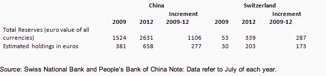 In the absence of data disclosure, one can only guess the currency composition of China’s reserves. According to various estimates, about 20-25% of China’s total foreign reserves are held in euro-denominated assets. This implies that over the last three years the People’s Bank of China has purchased about €270 billion, while Switzerland has done it for about €170 billion, somewhat less but fundamentally of a similar order of magnitude.