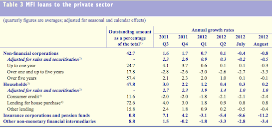 More fundamentally, nothing has been done to address the immediate issues of the continuing economic slow-down. We may now have a timeline for a legal framework, but 2014 is now looking like the delivery date for anything of substance when it comes to further Eurozone integration. The OMT has bought some time, lower sovereign yields are proof of that, but the economies of Europe are continuing to slow under the current fiscal program and the underlying dynamics haven’t changed as was once again demonstrated by the latest ECB bulletin’s credit data: