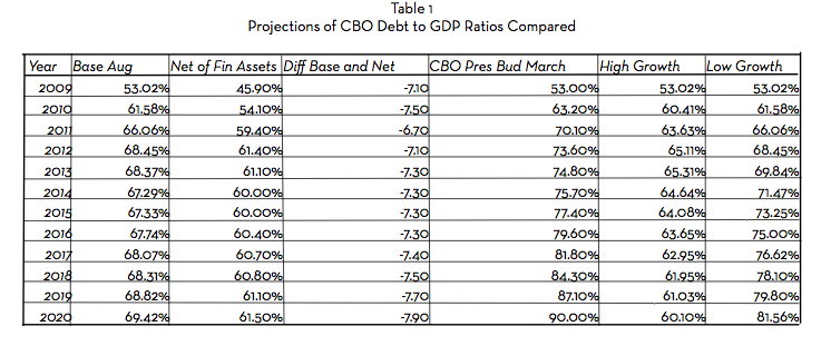 Our Table 1 displays the magnitude of the diðerence. The first two columns compare the CBO baseline budget projection, as slightly revised in August 2010, with the revised figures taking account of the U.S. government’s financial assets.69 The third column displays the diðerences between the first two, which are substantial. The fourth column shows the CBO’s March estimates of the impact of the President’s program; these figures also should be adjusted by the amount of the government’s financial assets that the CBO at last recognizes. This can be approximated by simply marking down each entry in the estimates of the President’s budget by the corresponding figure in column 3. Enacting the President’s fiscal program would not in fact push the US across the mythical 90% threshold. In 2020 the U.S. would be operating within the range of debt ratios at which other large countries function successfully right now.