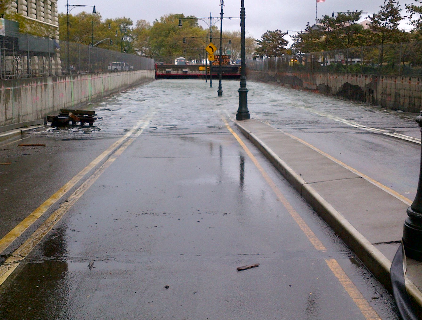 XXX and I have taken refuge on the upper east side where there is power and hot coffee. When we explored outside our apartment this morning, the damage above-ground seemed pretty minimal, though. A few trees down in Battery Park and the tunnel to the FDR from the West Side Hwy is still flooded to its roof (see attached). And no power below 40th street on the west side. I talked to a ConEd guy outside my building who said they’d been pumping out the vaults under the sidewalk where the equipment is for our electricity supply. After two hours, the water level hadn’t moved, so I expect we’ll be out of power for days. The flood waters completely receded above sidewalk level, though.