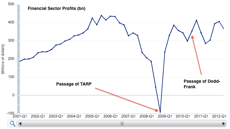 TARP (which is really shorthand for the bailouts, it means TARP and HERA, which is the bill that bailed out Fannie and Freddie, which was passed at roughly the same time) is correlated with a spike in financial profits. Dodd-Frank is correlated with… nothing.