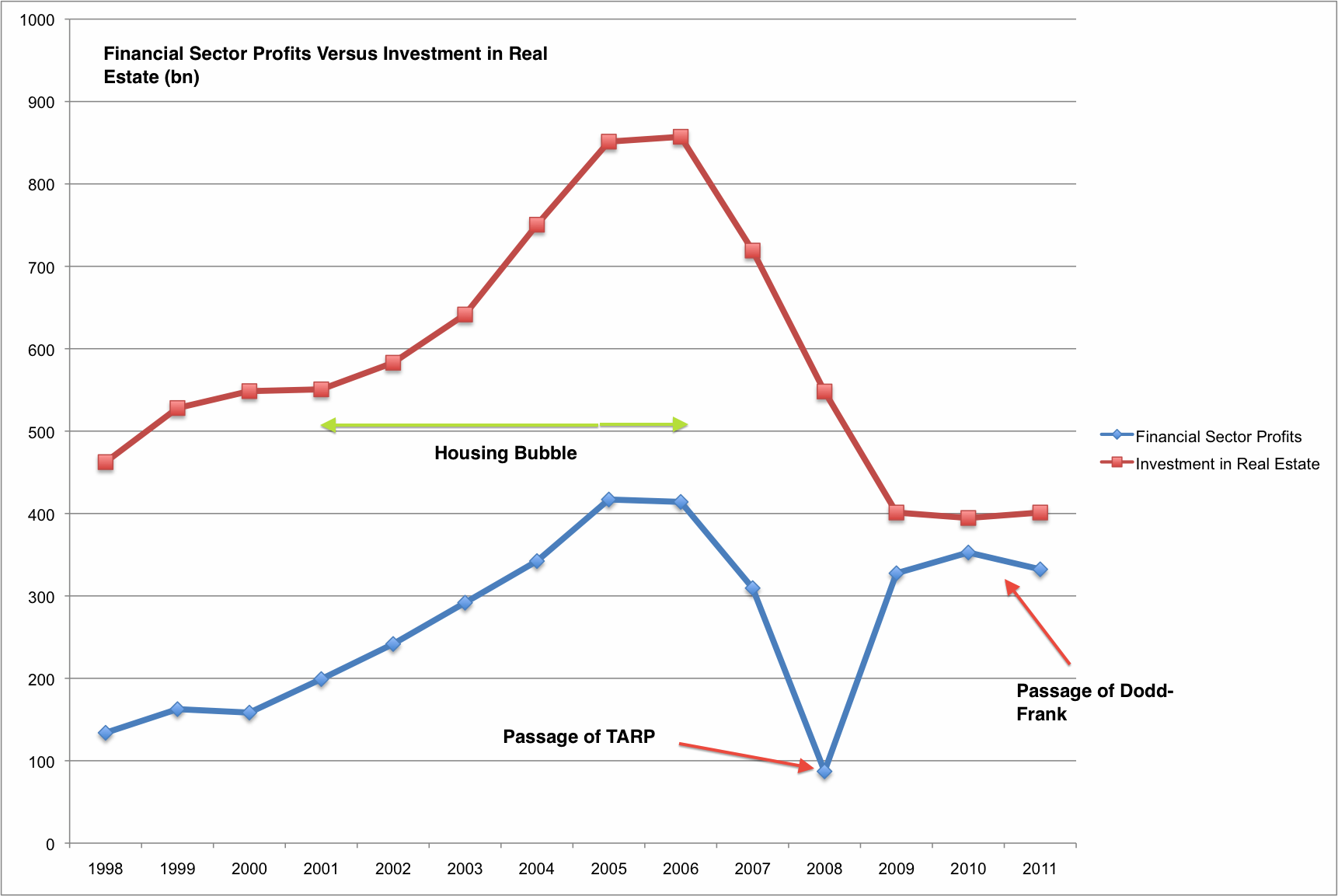 This chart reveals that financial sector profits are actually still at 2004 bubble levels, and that the profit increases and declines are correlated with the bubble and TARP, not Dodd-Frank.