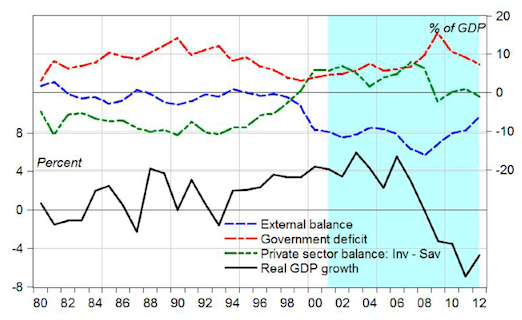 As you can see from the chart this all came to a screaming halt around 2007 when the GFC struck and Greece’s private sector was forced to re-enter a state of net saving. This was initially met by an increase in government deficit but austerity programs quickly turned this around and, as I explained above, this led to a situation where the only possible outcome was a fall in GDP while the sectors found a new equilibrium.
