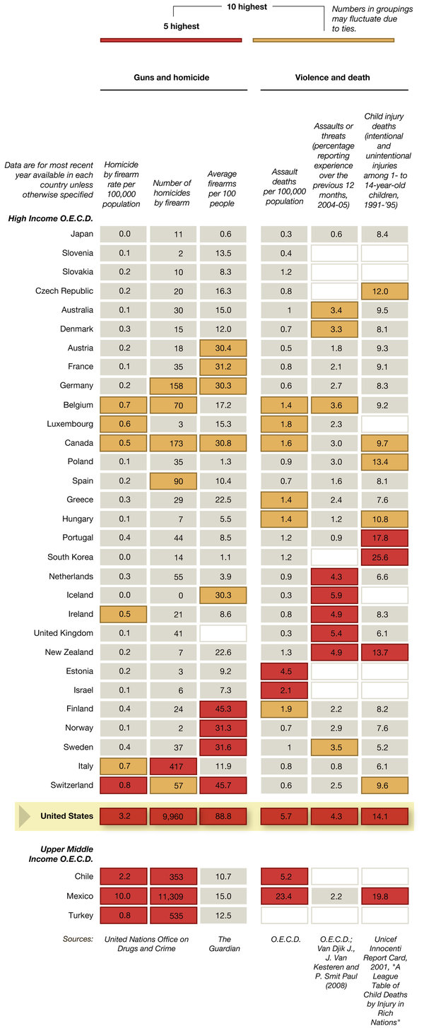 What it shows is that the US, with a rate of gun ownership nearly double that of the next highest county, has more gun murders than all other advanced economies combined. And that includes countries with rates of violence (defined as assaults or threats) as high or higher than that of the US. We have 4.3% of the population subjected to actual or threatened violence in the last six months; Ireland, Iceland, the Netherlands, the UK and New Zealand range from 4.3% to 5.9%. We had nearly 10,000 gun homicides. They had a grand total of 124, two full orders of magnitude lower. When you adjust for population, the firearm murder rate across these countries is tantamount to 442 for the US. And that’s before you get to the over 73,000 people per year here who are treated for gunshot wounds.