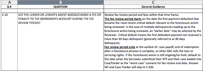 One of the regular battles was over the review period. The staffers in Tampa Bay were processing borrower complaints relating to foreclosures completed in 2009 and 2010. Bank of America managers would instruct the reviewers to look back from the completed foreclosure to what it called the nearest critical default and no further. But the questions form that they used when undertaking the test told them to use earlier default dates if they saw fit (see the “General Guidance” column, click to enlarge):