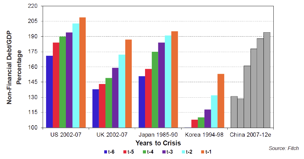 Possible self-imposed constraints on Chinese government spending if another financial crisis occurs. The Chinese government has reached a government debt to GDP ratio of 90%, which a widely cited study by Carmen Reinhart and Ken Rogoff found is correlated with lower growth. I’ve criticized this study, in that it mixes actual and de facto gold standard countries with fiat currency issuers, and also suggests causality (as in higher debt leads to lower growth) whereas in many cases, the cause is more plausibly that a financial crisis caused debt levels to blow out because tax revenues collapsed and impaired growth permanently. Nevertheless, if the Chinese think increasing debt levels further is a bad thing (as in they buy the Reinhart/Rogoff thesis), they might not respond as aggressively as the did in the wake of the global financial crisis. (Note this is my take on the GMO 90% government debt to GDP ratio; the report raises it as a concern in and of itself).