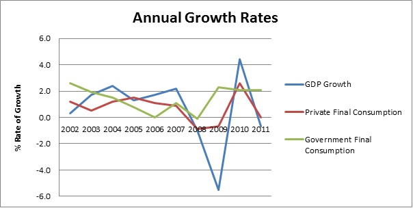 So, what is actually going on with Japan? In order to understand this better we need to look at the data with respect to the last stimulus to see what it did and what it didn’t do, and try to figure out why. The first graph below is Japan’s annual GDP growth rate plotted together with annual growth rates of private sector final consumption – that is, by households and businesses – and government sector final consumption. This, I think, is the key graph to understanding the nature of the so-called Japanese disease.