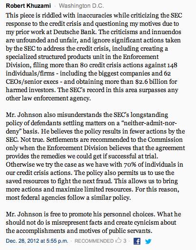 Khuzami responded in the comments section (I’m assuming it is indeed Khuzami; the post has been up for days and several readers pinged me about it. The SEC would surely be aware of it and would presumably have asked for it to be removed if it was a fabrication):