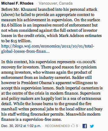 As for the four published responses to Khuzami’s reply that appear on the Times’ site, Khuzami’s comment came 36 hours after Johnson’s piece was first posted, meaning many readers of the article never saw what Bob had to say. But probably more significant is the fact that the Times moderates the comments, so who knows how many responses came in but did not make it online. My own submission to the Times, which they determined was unfit to print, went something like this: