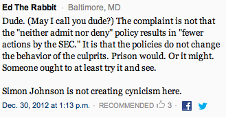 If he felt it important to have some sort of response to Johnson in the comments section, the way to do THAT would be to have a SEC minion, ideally the communications person, do it. Doing it personally was a sign he couldn’t contain himself over the holiday period. He could not wait to get someone on it and lacked sufficient emotional control to restrain himself. So the real story is that the criticism is getting to Khuzami. That is entertaining.