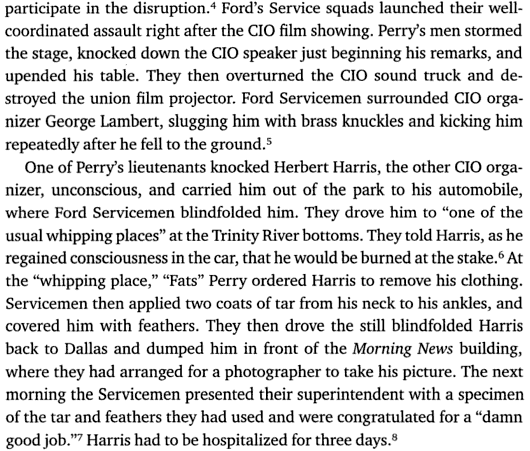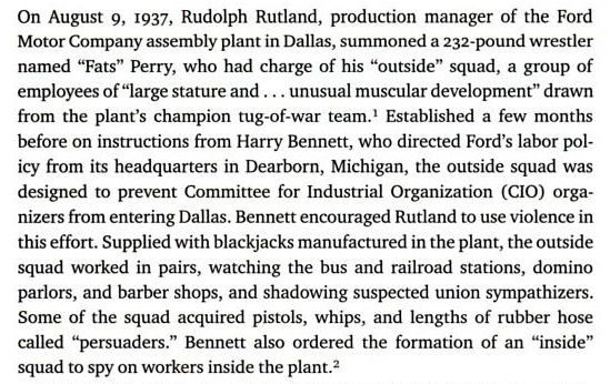 Don’t kid yourself into thinking that this was an isolated incident. This was what the NLRB later described as Henry Ford’s war on unions. Bennett built the world’s largest private army. And it was not as if he was wanting for competition. GM and Chrysler also had their hired goons, but they worked through intermediaries to keep their hands cleaner.