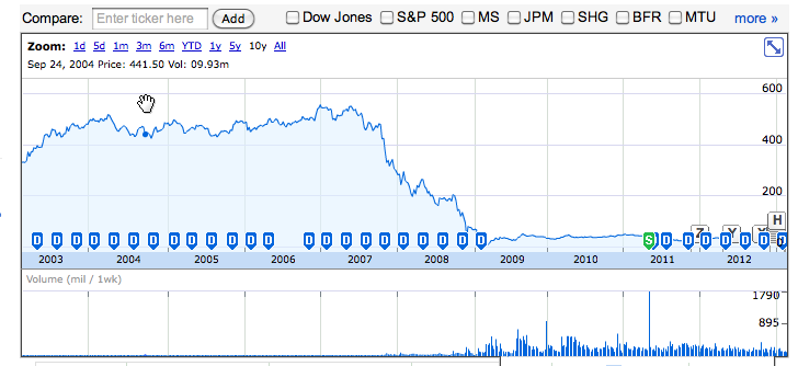 It is really hard to discern the scales, but Lew’s $700,000 award would have been made when Citi was trading (in post reverse split term) in the $480 to $500 a share range. When he joined the Obama administration as deputy secretary of state, the stock was in the $15 to $18 range. So it was pretty much worthless. Any restricted stock component of his 2007 bonus would also have lost most of its value.