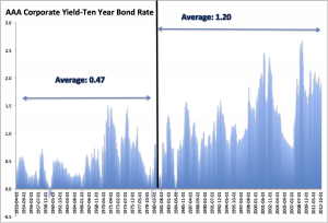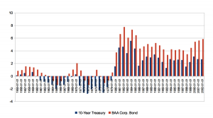 The graph shows the difference in spreads between corporate bonds with AAA ratings from Moody’s at the time of issuance and the 10 year treasury bond rate. The spread between the AAA corporate yield and the 10 year bond rate also began to rise around the same time (i.e around 1980). Since 1980, however, the annual default rate on bonds of corporations with AAA ratings at issuance, has been approximately 0.05 percent. Given an average recovery rate of around 50 percent, the default losses have been about half that. But the premium of AAA bonds over 10-year treasuries has been 1.2 percent (i.e. more than 40 times the expected annual default loss).