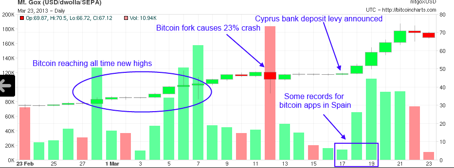 I agree with the skeptical quote: “Most of users of BTC are exchangers who enjoy in speculating.” Limiting the creation of new bitcoins and then opening the spanish access when Cyprus goes into crisis, it makes sense that there was a buying frenzy and prices flew up. I would not read into it any further than that. not going to be allowed as a “new currency” but the fed will come up with their own knock off eventually.