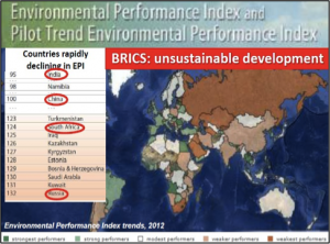 How bad are the BRICS? The 2012 Columbia and Yale University Environmental Performance Index showed that four of the five states (not Brazil) have been decimating their – and the earth’s – ecology at the most rapid rate of any group of countries, with Russia and South Africa near the bottom of world stewardship rankings.[1] And China, South Africa and India have declining scores on greenhouse gas emissions, according to the EPI.