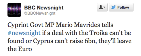 Now the Eurozone is actually not keen about the idea of a Cyprus exit, since any country leaving raises the ugly possibility that someone else will depart. That in turn will lead to deposit flight of the countries seen to be most at risk (Portugal, Spain, Italy). That was straining the Eurozone prior to the OMT, which managed to calm down depositors enough to arrest money-moving. If the Cypriots were to impress upon the Troika that they were deadly serious about leaving, there is a small possibility that the Troika will blink and allow the ECB to keep funding Laiki while they wrangle. I am not certain that this leads to happy endings so much as keeping a tense situation in play.