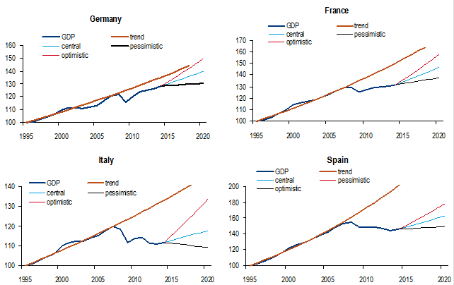 This exercise suggests that in the absence of policy reforms, trend growth will have been damaged significantly, by at least one percentage point, post-crisis, compared with pre-crisis levels, although our range of estimates is quite large depending on the set of assumptions being used. However, under the most favourable set of assumptions which would assume significant policy reforms (investment recovers to pre-crisis growth levels, rapid decline in the unemployment, rapid catch-up with the technology leader), trend growth would be in line with pre-crisis levels and could even be higher in Italy and Germany which had the lowest trend growth prior to the crisis.