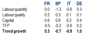 Results prior to the crisis are in line with most estimates (Figure 1): Spain had the highest trend growth (3.7% per annum, thanks to an inflated rise of capital and low qualified labour); followed by France; with Germany and Italy in the lowest positions because of subdued labour contribution in the former, and poor productivity in the latter (see Table 1).