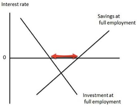 OK, to the argument. After showing a diagram where investment at full employment intersects savings at full employment at a negative interest rate, Keen states: “But since the interest rate can’t be negative (the nominal rate – the real rate can be with significant inflation, but of course we don’t have that right now), there is disequilibrium in IS market.” Sorry, folks, that does not follow. What does follow is that there is not a **full employment** equilibrium in the IS market. Since we are far from full employment, that’s a big DUH, good buddy.