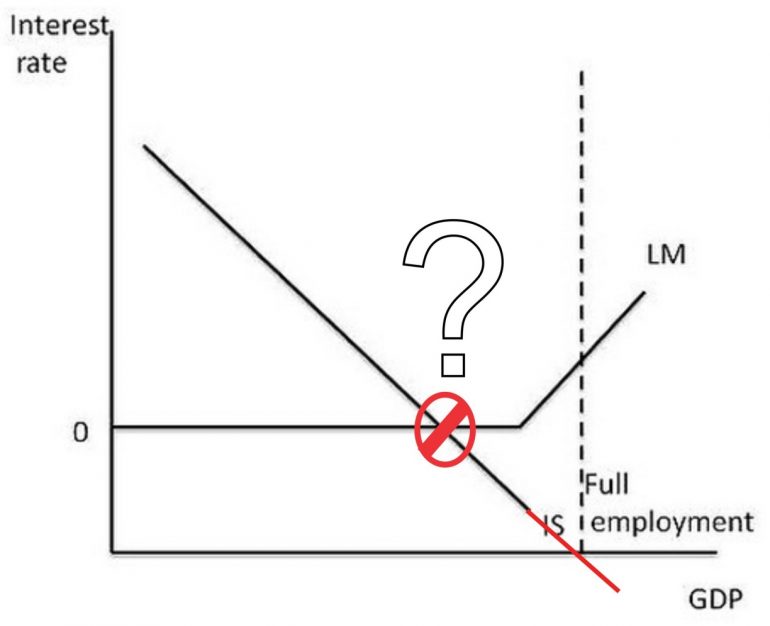 “That would then mean that the actual economy was in a location like “X marks the spot” in figure 9 below – but that can’t be right either since we know the interest rate is zero, and X is below the zero mark.”