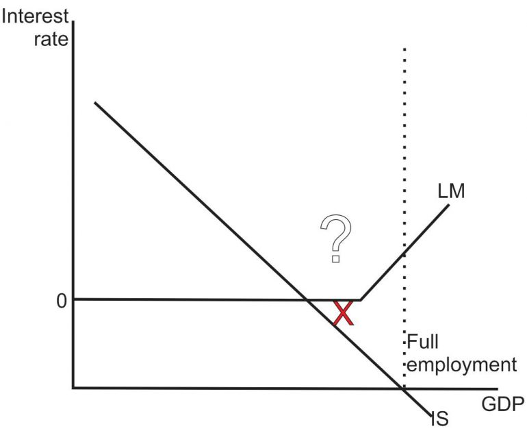 Firstly, the LM curve, (representing Liquidity Preference – Money Supply) is horizontal at the “zero lower bound”, since when nominal rate of interest reaches zero, there’s no point in buying bonds – it’s wiser to keep your money in cash. And secondly, during a Depression, private demand can fall so much that the intersection of IS (representing Investment – Saving) and LM occurs at a level of GDP well below the full employment level. The economy is in an equilibrium with involuntary unemployment (see figure 7).