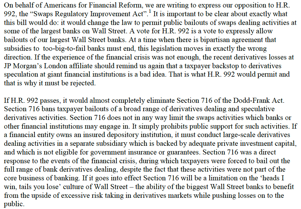 Americans for Financial Reform has written a series of layperson friendly letters opposing each of these bills. The first is to pretty much eliminate Section 716 of Dodd Frank, which would force banks like Bank of America and JP Morgan to take their derivatives operations out of taxpayer-backstopped subsidiaries and house them in separately-financed operations. This is the germane section discussing the House bill (its Senate evil twin is S. 474):