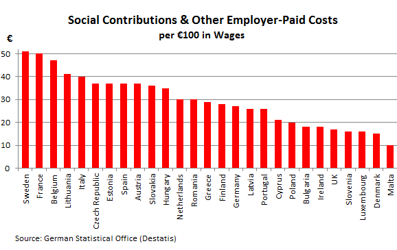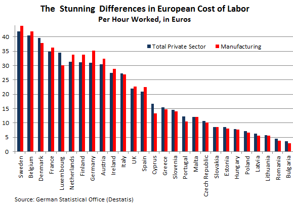 In Europe’s private-sector, the cost of labor—gross earnings plus employer-paid social contributions, pensions, disability, etc.—is marked by stunning differences.