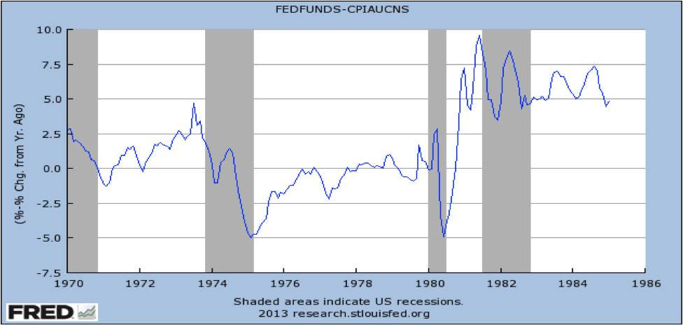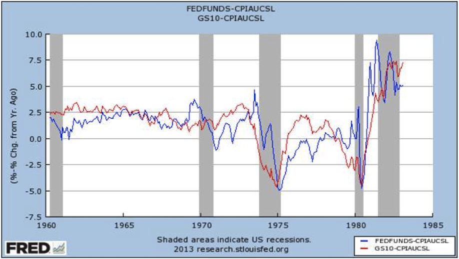 This pattern of progressively wider swings is also visible in the “real” Fed funds rate and the “real” 10- year Treasury yields.