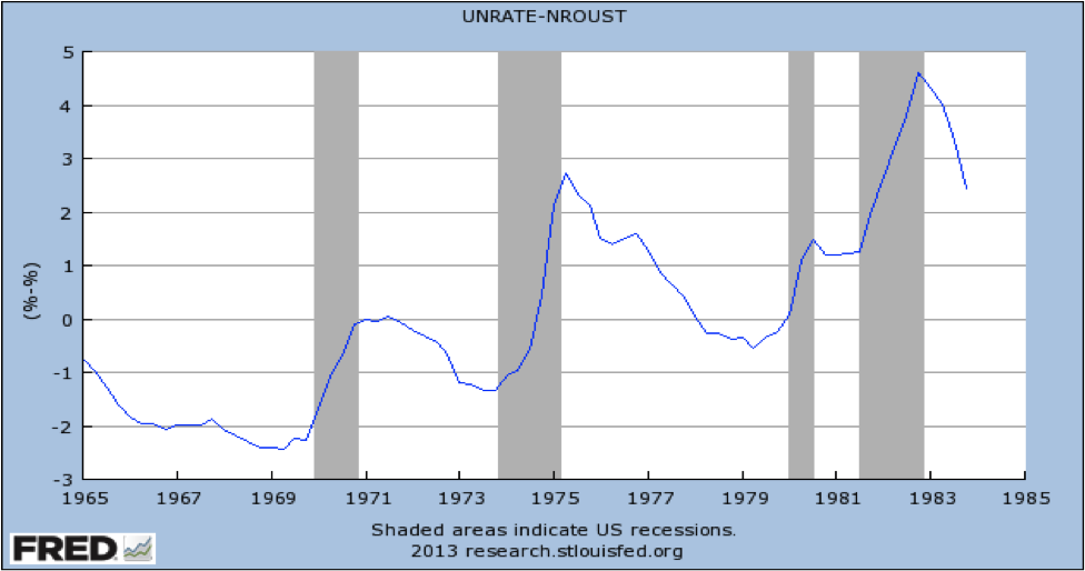 However, by mid-1984, the difference between the unemployment rate and the CBO’s estimate of the short-term natural rate of unemployment (NAIRU) was approximately the same as it was in the mid 1970s, at which time the inflation rate had been 10 percentage points higher. Furthermore, the rate of decline in the unemployment rate post the cycle trough in 1982 was more rapid on average than the decline post the cycle trough in 1975. Most important was the break from the pre-October 1979 pattern of progressively larger cyclical swings in unemployment rates from progressively higher cyclical troughs.