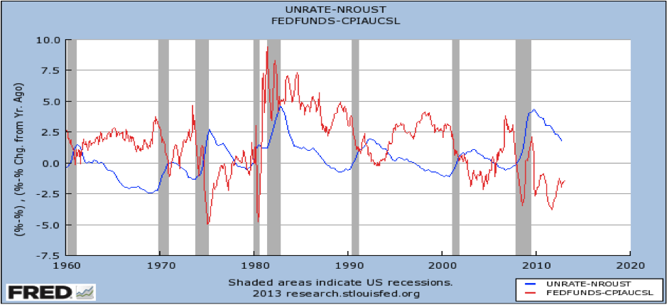Once recession and then the financial crisis hit, monetary policy changed yet again. The policy response followed a path laid out in earlier Bernanke speeches. It had been the Fed position that a Japan-like outcome-years of slow growth and elevated levels of unemployment- could be avoided even after a financial market crisis if the central bank aggressively cut interest rates. The Fed did cut rates aggressively in two steps. The first step took the Fed Funds rate from 5.25% to 2% (and approximately 0.0% real) in just 10 months. The second step, roughly coincident with the Lehman crisis, took the Fed funds rate from 2% to approximately 0% (and approximately -2% in real terms) in 4 months. However, while the recession is finally over (NBER), growth — especially job growth — has lagged. Since 2008, with growth lagging and the Fed funds rate constrained by the zero bound, it became impossible for the Fed to generate the Fed funds rate implied by the Taylor Rule. With the Fed funds rate already near zero, the FOMC followed Bernanke’s “playbook” and monetary policy became “unconventional”, i.e., with bouts of credit and quantitative easing.